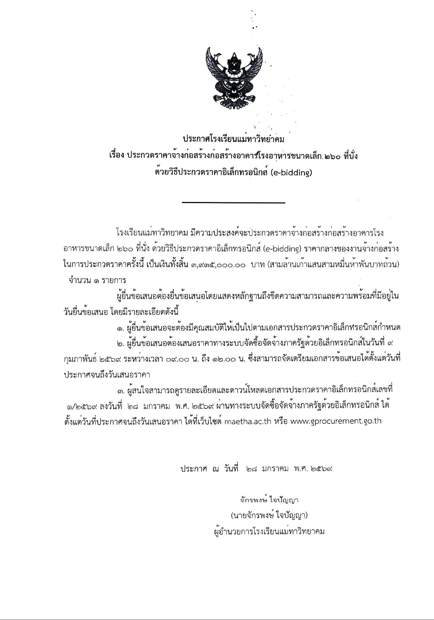ประกาศโรงเรียนแม่ทาวิทยาคม เรื่องประกวดราคาจ้างก่อสร้างก่อสร้างอาคารโรงอาหารขนาดเล็ก 260 ที่นั่ง ด้วยวิธีประกวดราคาอิเล็กทรอนิกส์ (e-bidding)